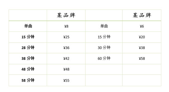 湖北恩施州:部分品牌單曲收費8元,包時15分鐘收費20元、30分鐘38元、60分鐘58元。也有單曲收費5元,包時15分鐘收費20元、1小時收費64元。