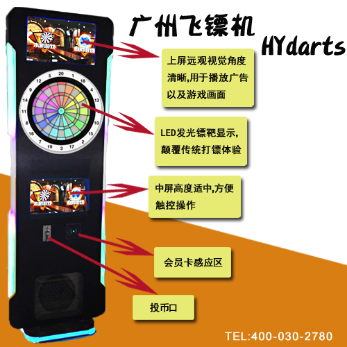 HYdarts廣州飛鏢機,沿襲娛樂、時尚、活潑的理念,外觀重新設計,浩田聯網飛鏢機,就是一款“內外兼修”的新型娛樂設備,其外觀設計簡潔大氣,融入更多時尚感娛樂感更強的燈效組合,配合飛鏢特效,讓你在打鏢時縱情所享。